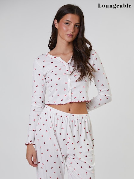 Loungeable Cherry Printed Ribbed Jersey Long Sleeve and Trouser Pyjamas Set