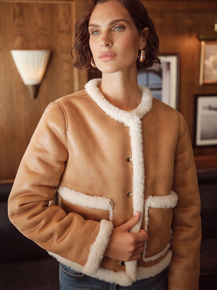 Hellbraun - Love & Roses Kragenlose Lammfelljacke