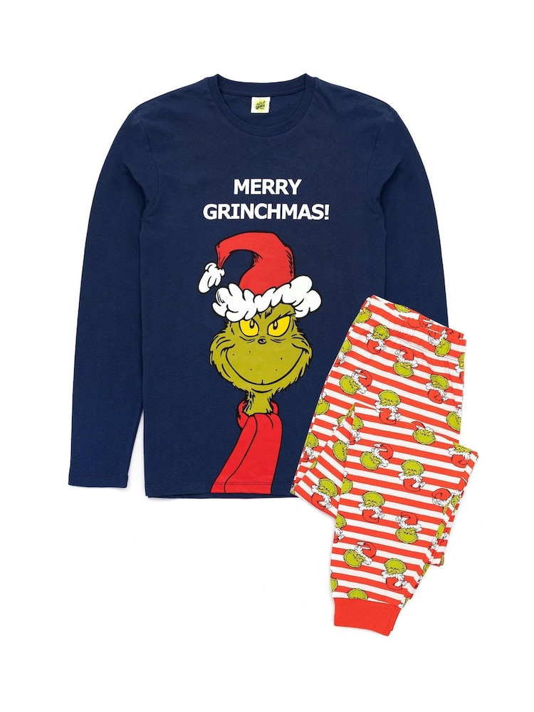 Blau - Vanilla Underground – Unisex-Pyjama-Set mit langen Ärmeln und langen Beinen aus 100 % Baumwolle mit dem Grinch, weihnachtliches Motiv „Merry Grinchmas“