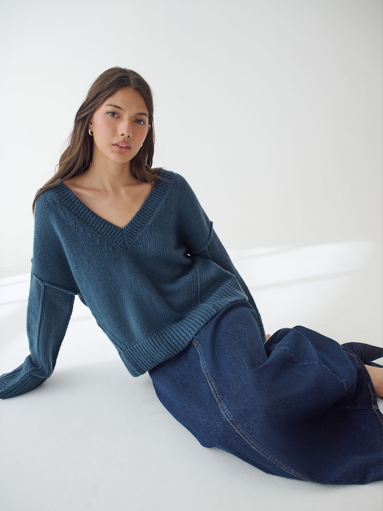 Dunkelblau - V-Ausschnitt-Strickpullover mit Nahtdetail