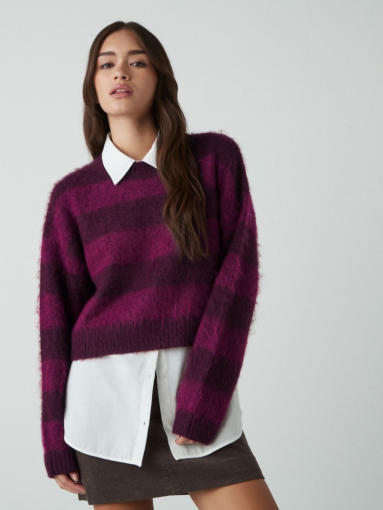 Burgunderrot/Rot gestreift - Strickpullover im Hemd-Lagenlook aus weichem angerautem Material