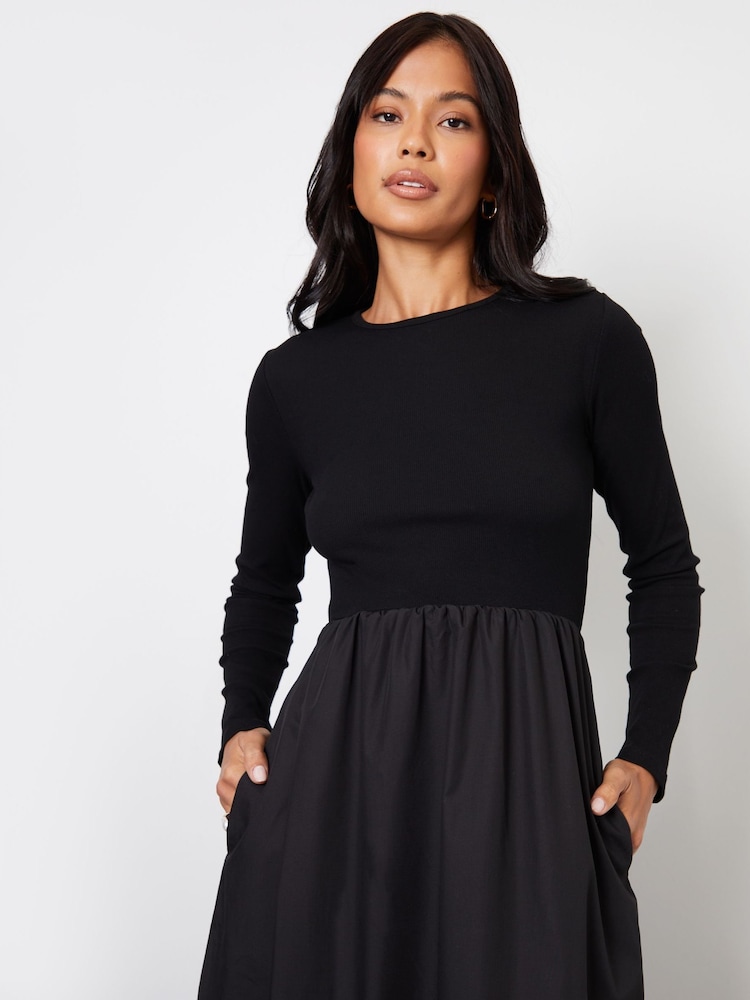 Schwarz - Threadbare – 2-in-1-Midikleid aus geripptem Jersey mit Rock aus Popeline-Material