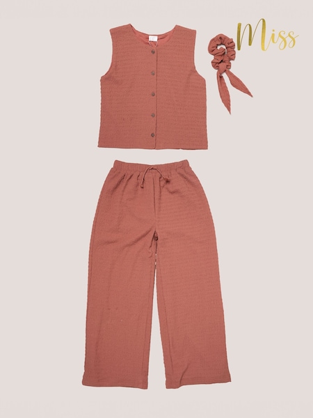 Miss Red Textured Top Wide Leg Trousers And Scrunchie Outfit Set