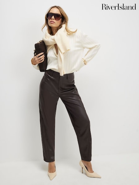 River Island Brown Faux Leather Seam Detail Barrel Leg Trousers
